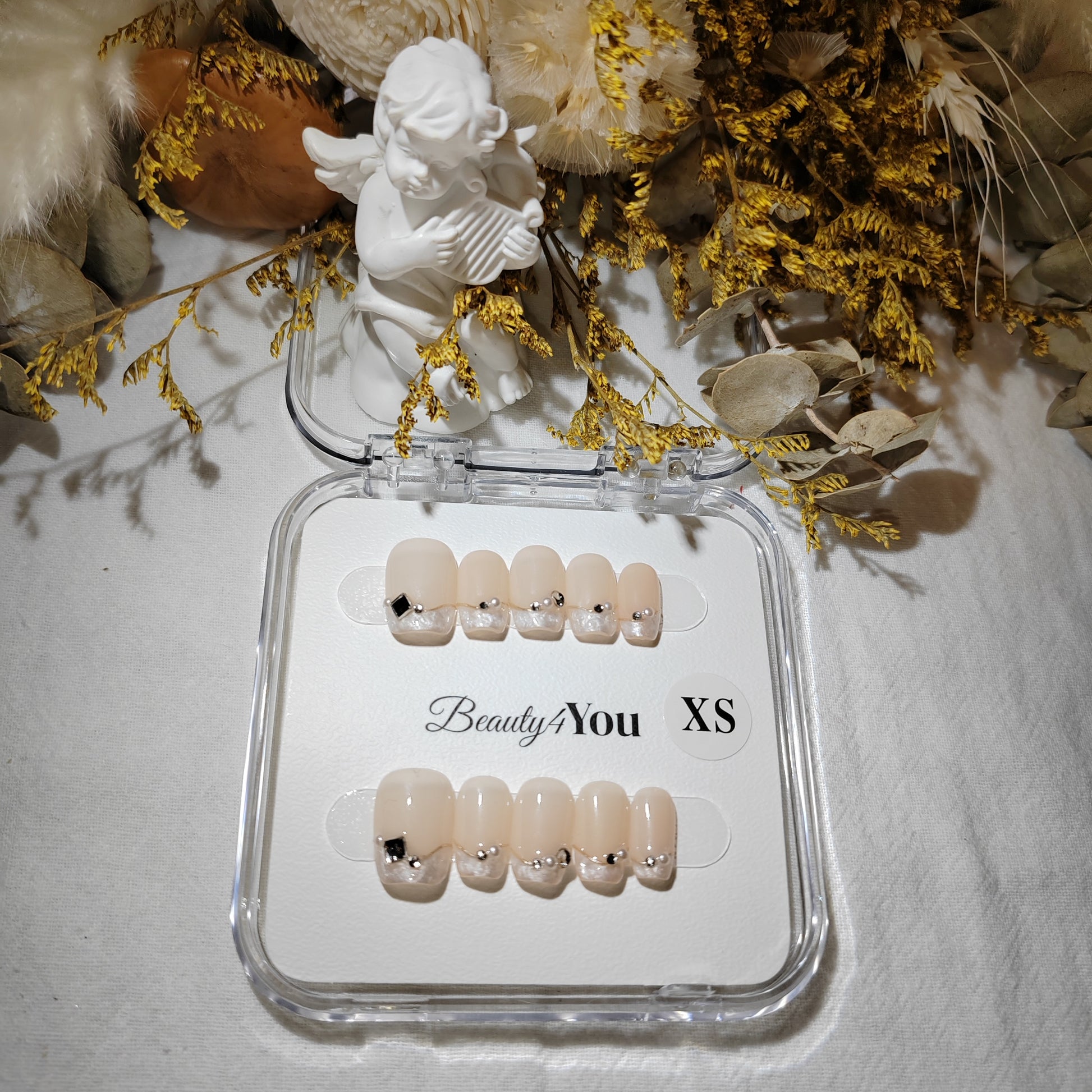 Una base minimalista color piel realzada con puntas en blanco perlado, cuentas plateadas y un llamativo detalle de gema negra. Moderno y chic, este conjunto combina una sutil elegancia con un impactante toque de contraste.