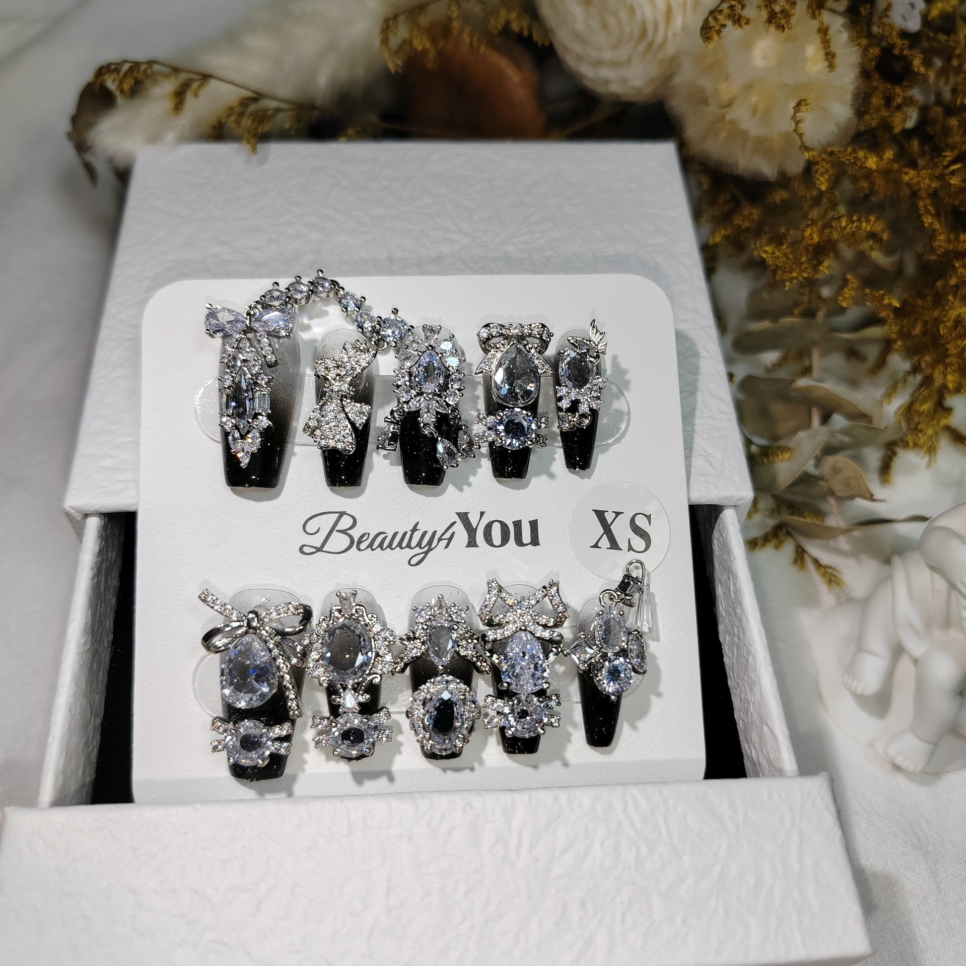 Una atrevida base negra adornada con cristales extragrandes, motivos de estrellas y delicados detalles de cadena, evoca la majestuosidad de un cielo estrellado de medianoche. Elegante pero imponente, este diseño está hecho para quienes encarnan el misterio, la fuerza y un encanto irresistible.