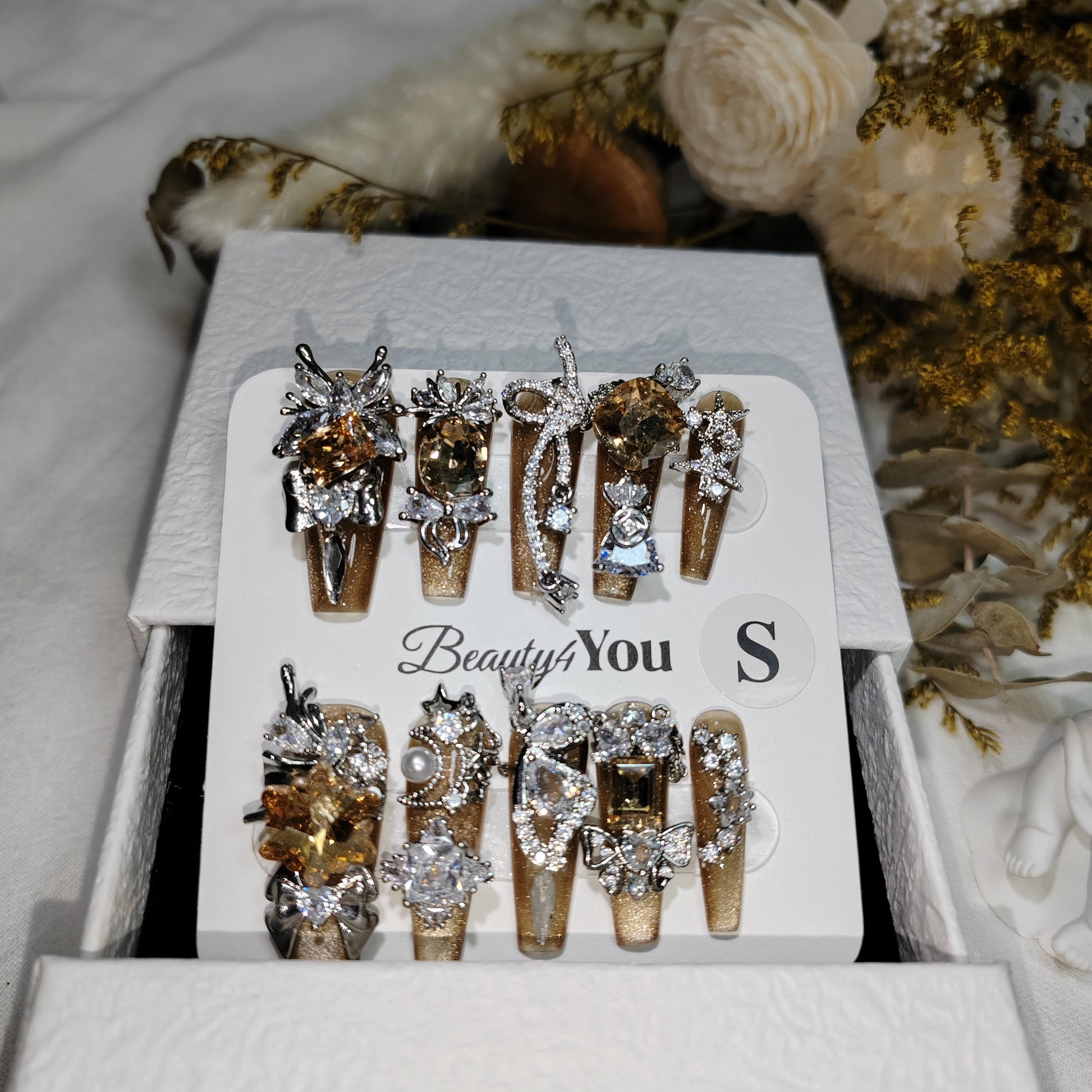 Una majestuosa base dorada adornada con gemas en tonos champán y ámbar, combinada con radiantes cristales y delicadas perlas. Este majestuoso diseño captura el esplendor de las coronas reales, poniendo a tu alcance una opulencia atemporal y una elegancia majestuosa.