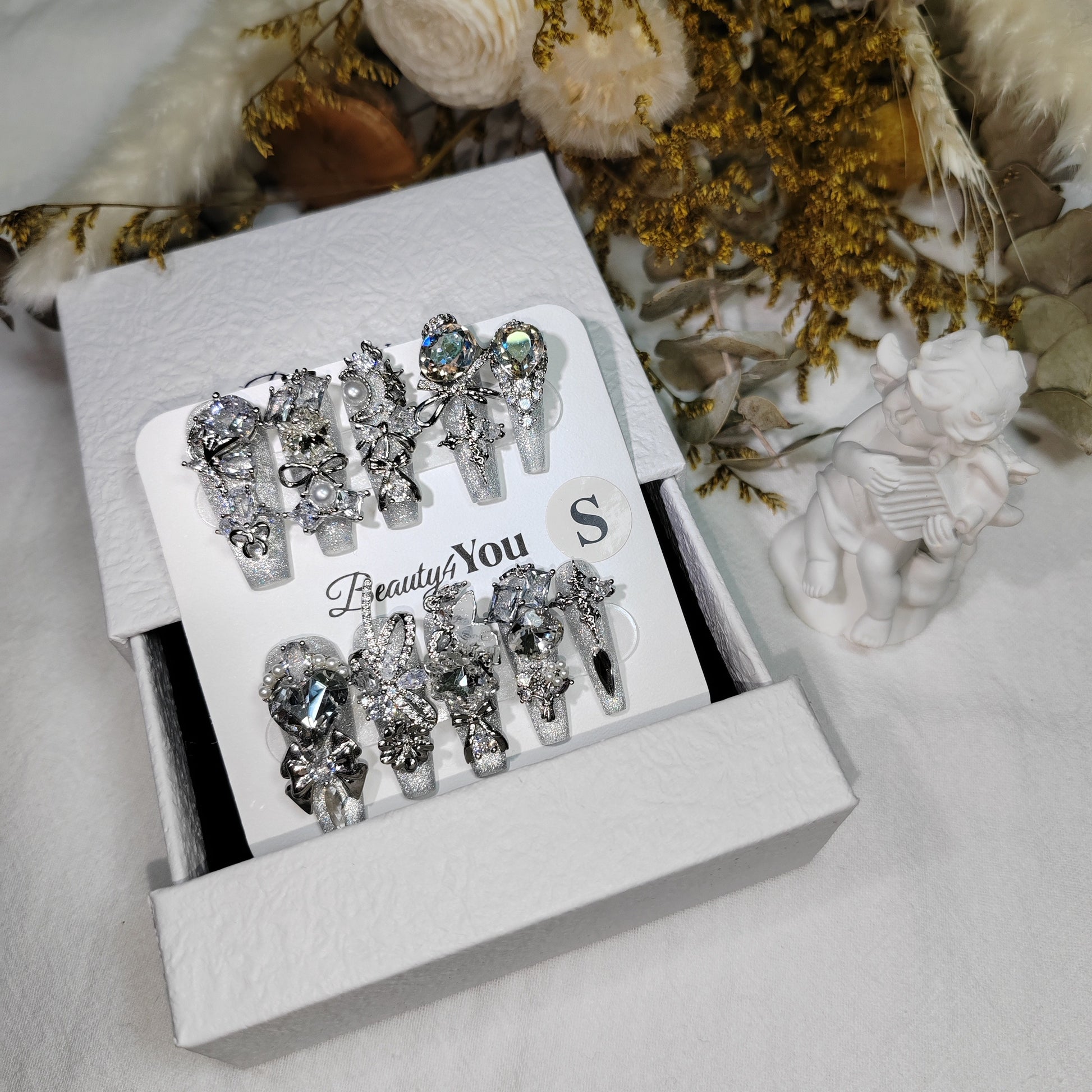 Uñas plateadas brillantes coronadas con deslumbrantes cristales, perlas y delicados lazos. Este diseño evoca la elegancia de una emperatriz invernal, combinando un brillo gélido con un toque de gracia femenina para un look impactante e inolvidable.