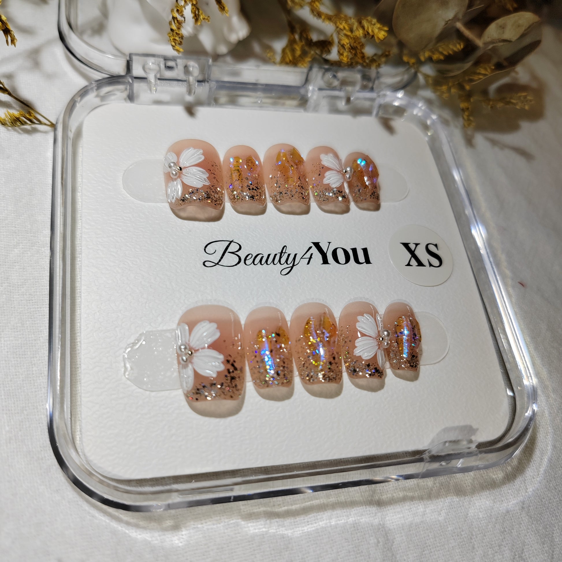 A nude-pink base sprinkled with shimmering glitter and accented by delicate white daisies. Fresh and playful, this design brings the joy of a sunlit meadow with a touch of sparkle