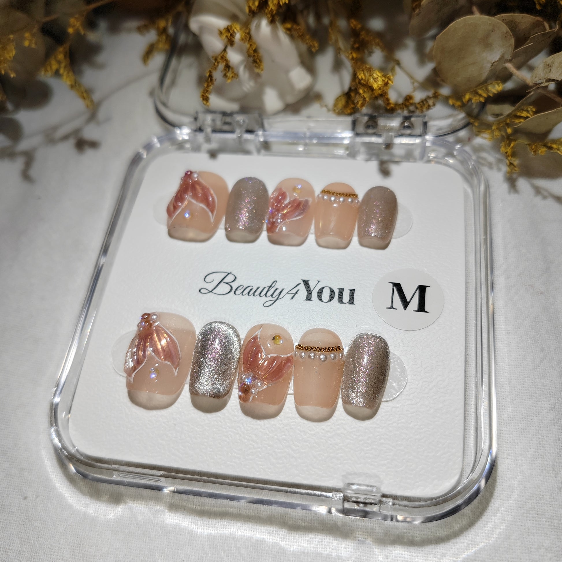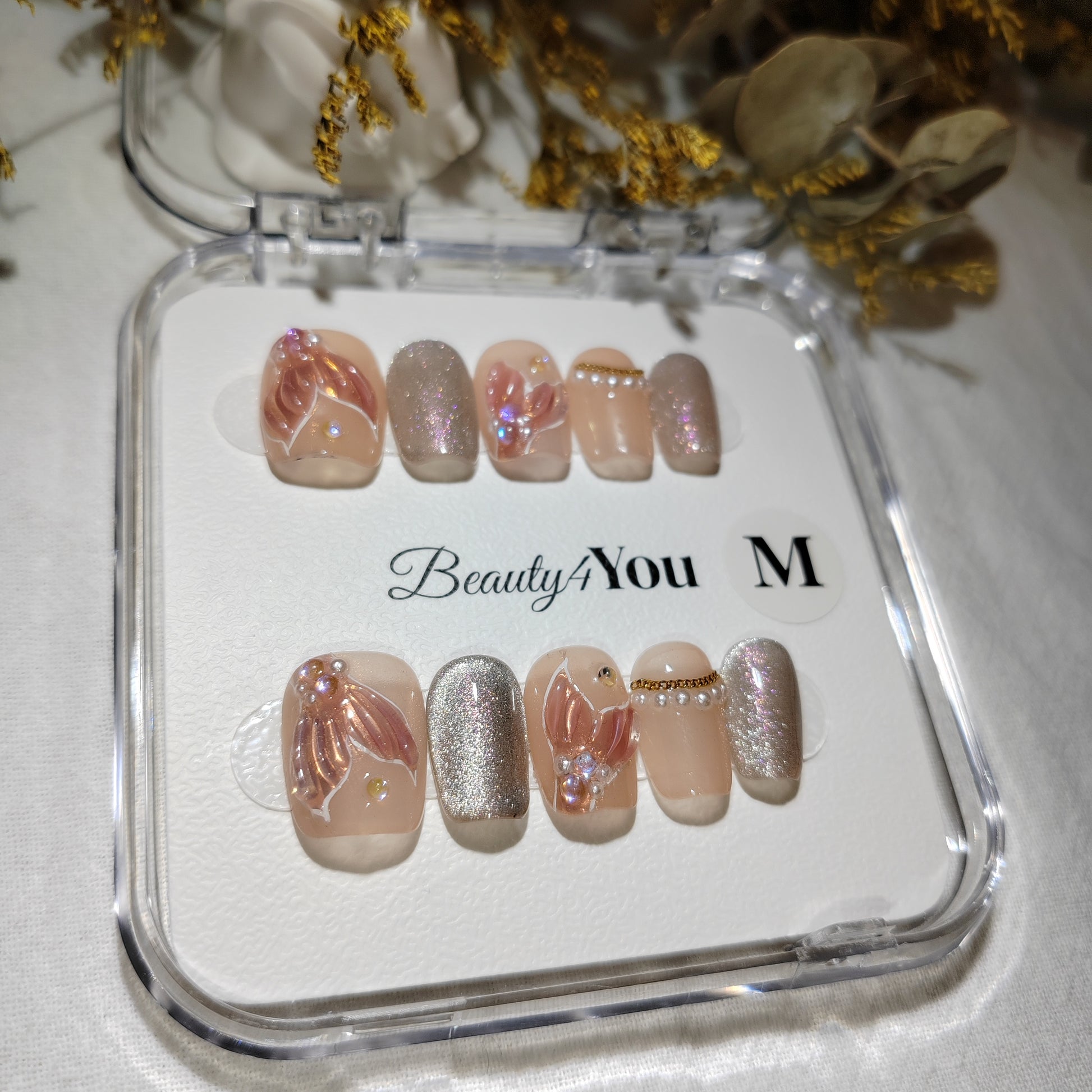 Inspired by the elegance of mermaid tails, this set features a nude-pink base with shimmering silver accents, delicate pearls, and flowing fishtail details. Graceful and enchanting, it captures the magic of the ocean in a sophisticated style.