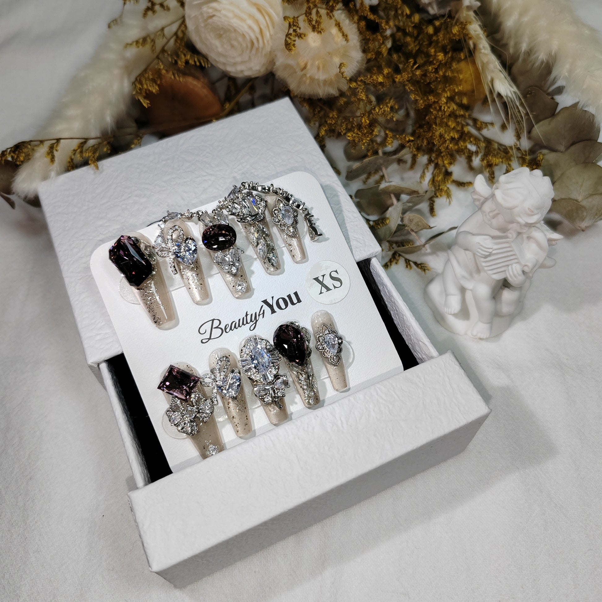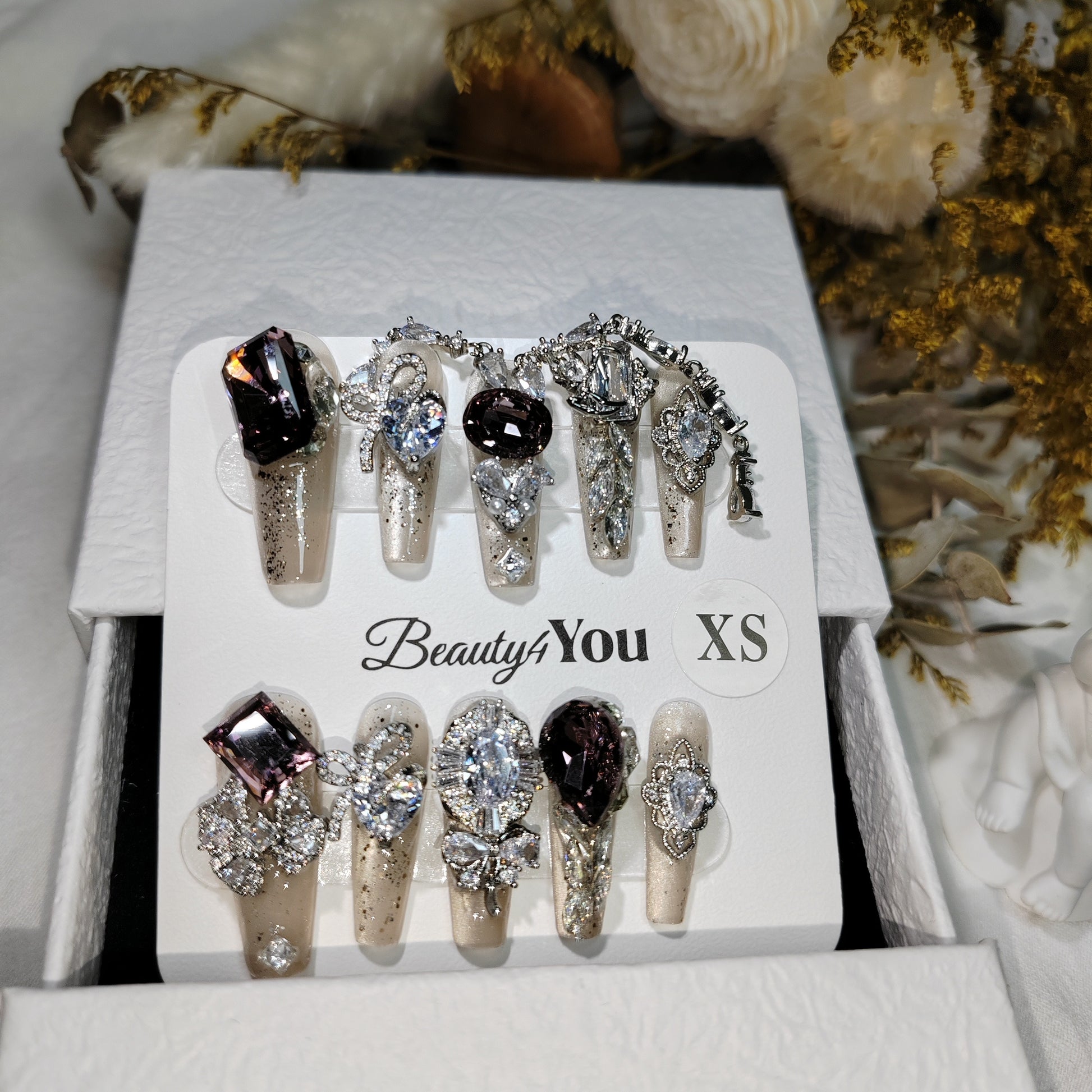 A radiant silver base adorned with oversized amethyst and crystal gemstones, paired with intricate crown-like embellishments. Majestic and dazzling, this design embodies the grace and authority of true sovereignty.