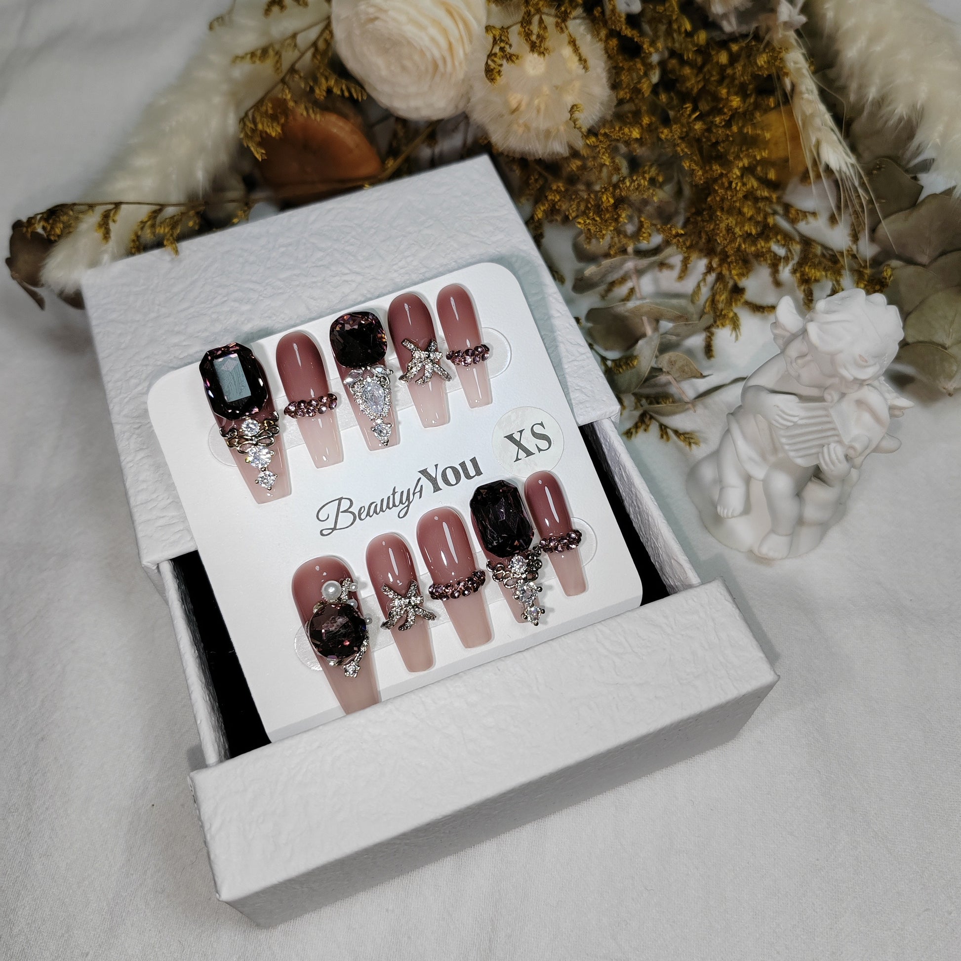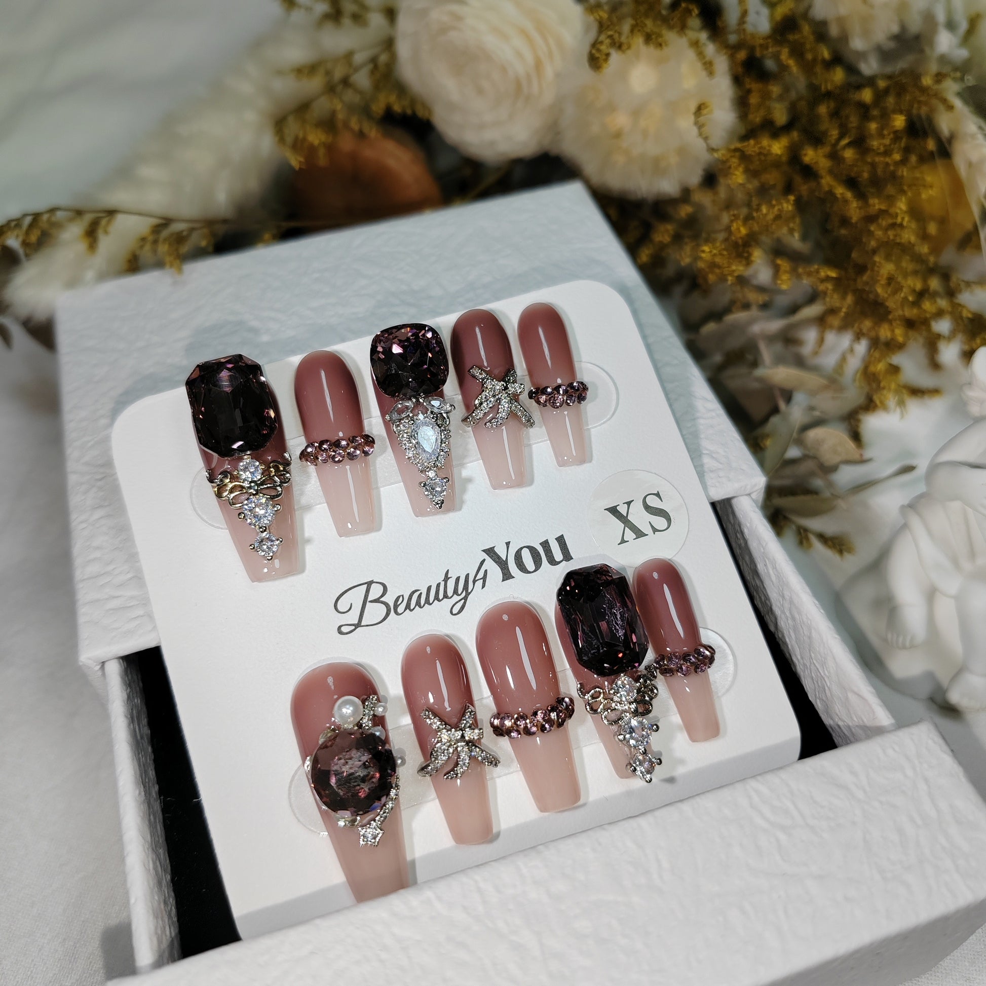 A refined nude base crowned with bold amethyst-toned gemstones, pearls, and diamond-cut embellishments. Luxurious and regal, this design embodies the elegance of royal jewels with a modern couture twist.