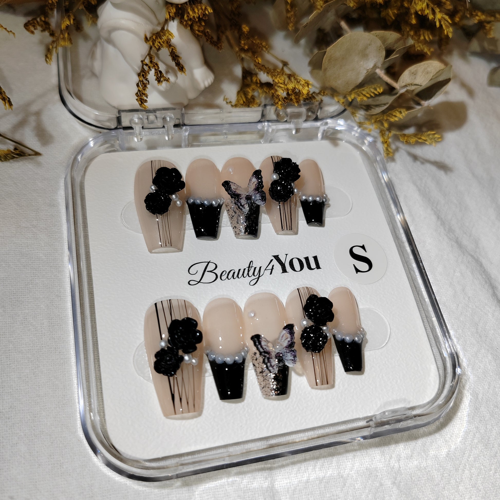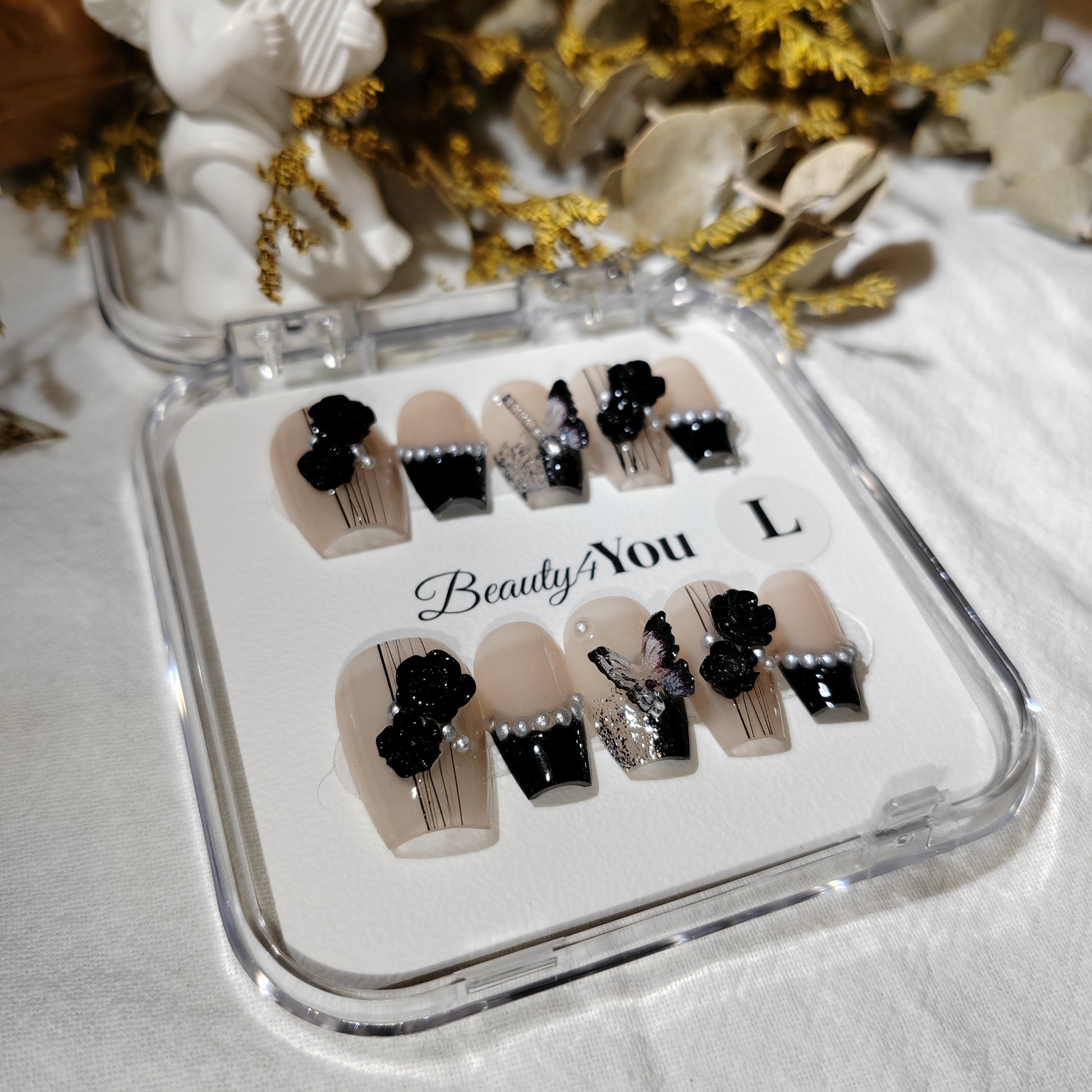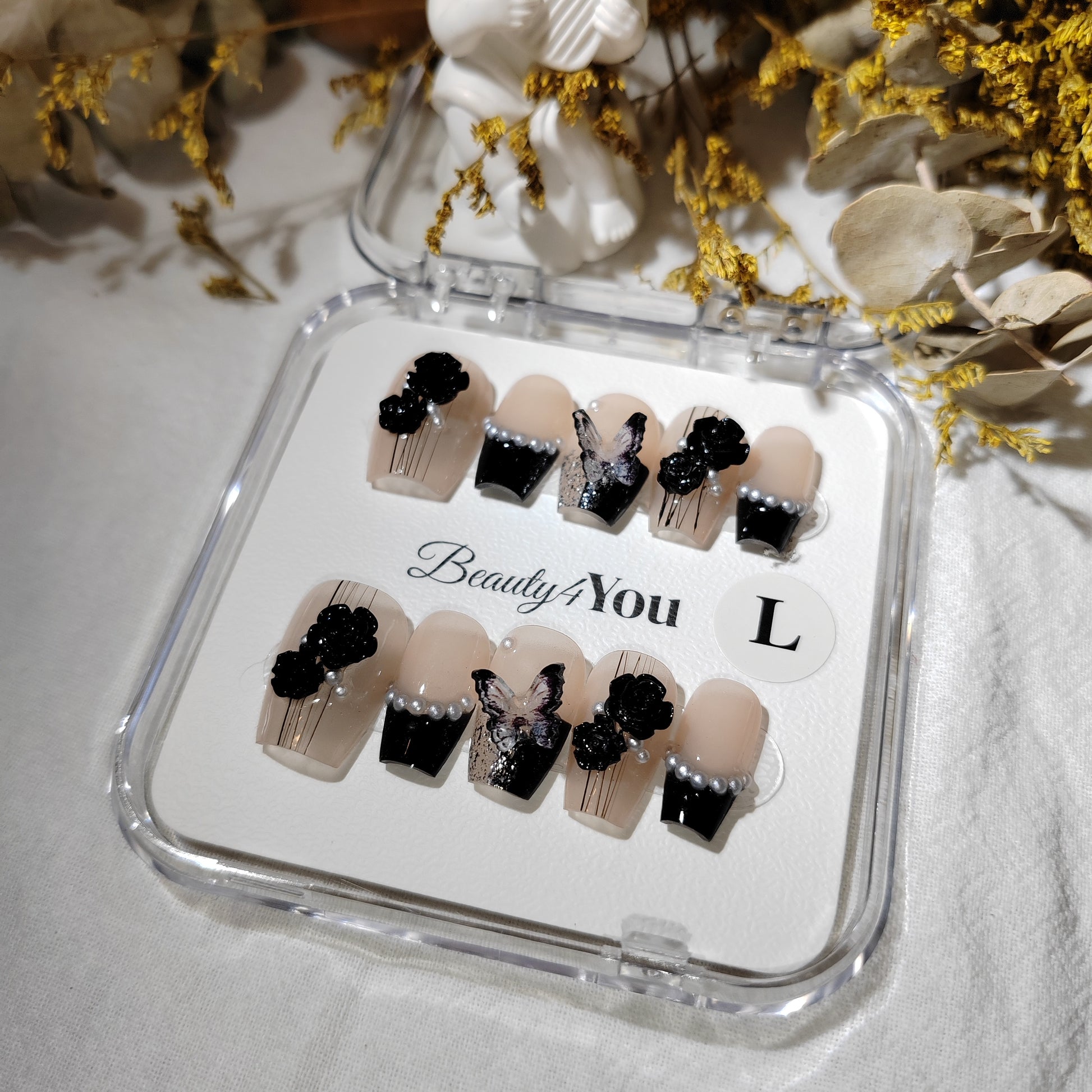 A nude base contrasted with bold black tips, adorned with 3D black florals, delicate pearls, and a shimmering butterfly accent. Elegant yet edgy, this design channels the mystery and allure of velvet night.